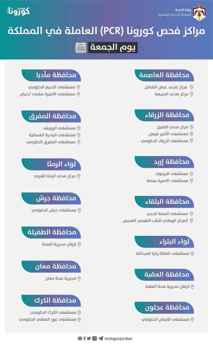 مراكز فحص كورونا (PCR) العاملة يوم الجمعة في المملكة حسب التالي: