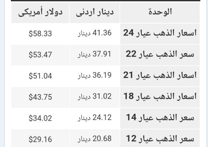 ويشمل التقرير أسعار المعدن في الاردن بجميع عيارته (24,22,21,18,14,12 ) .