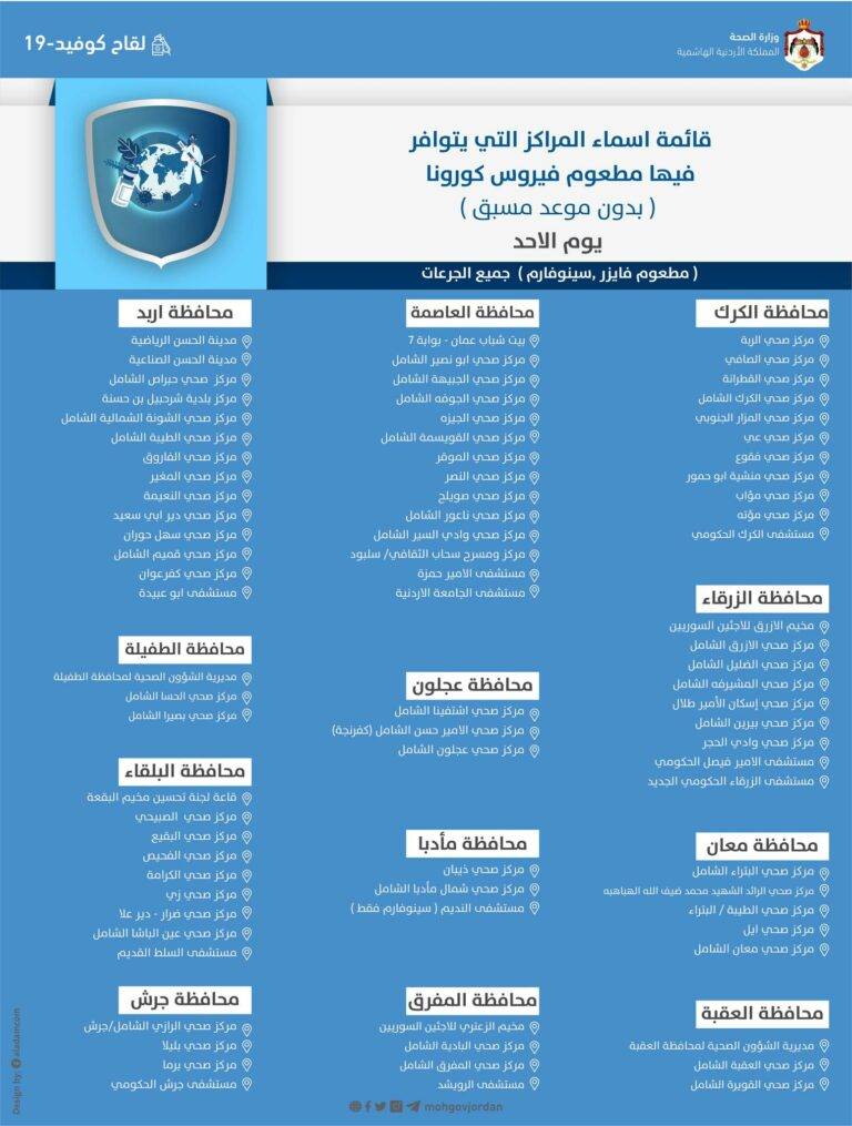 أعلنت وزارة الصحة عن قائمة أسماء المراكز التي يتوافر فيها مطعوم فيروس كورونا (دون موعد مسبق) وبجميع الجرعات ليوم الأحد.