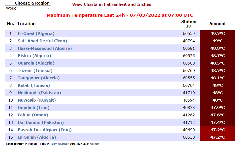 وبحسب ما ذكر موقع "EldoradoWeather"، فقد بلغت درجة الحرارة 49.2 درجة مئوية في مدينة الوادي الجزائرية، وهي أعلى درجة حرارة فوق الأرض، في حين تبعتها منطقة صافي آباد دزفول الإيرانية من حيث الحرارة، حيث بلغت الحرارة فيها 49 درجة مئوية، وتبعتها مناطق عدة في الجزائر كالآتي: "