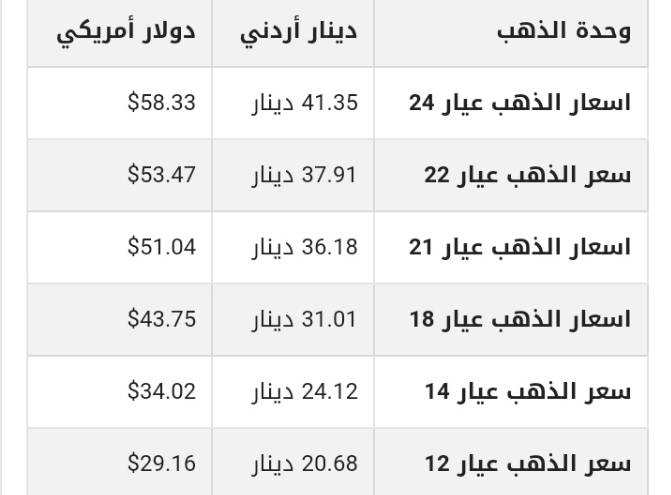 ويشمل التقرير أسعار المعدن في الاردن بجميع عيارته (24,22,21,18,14,12 ) .