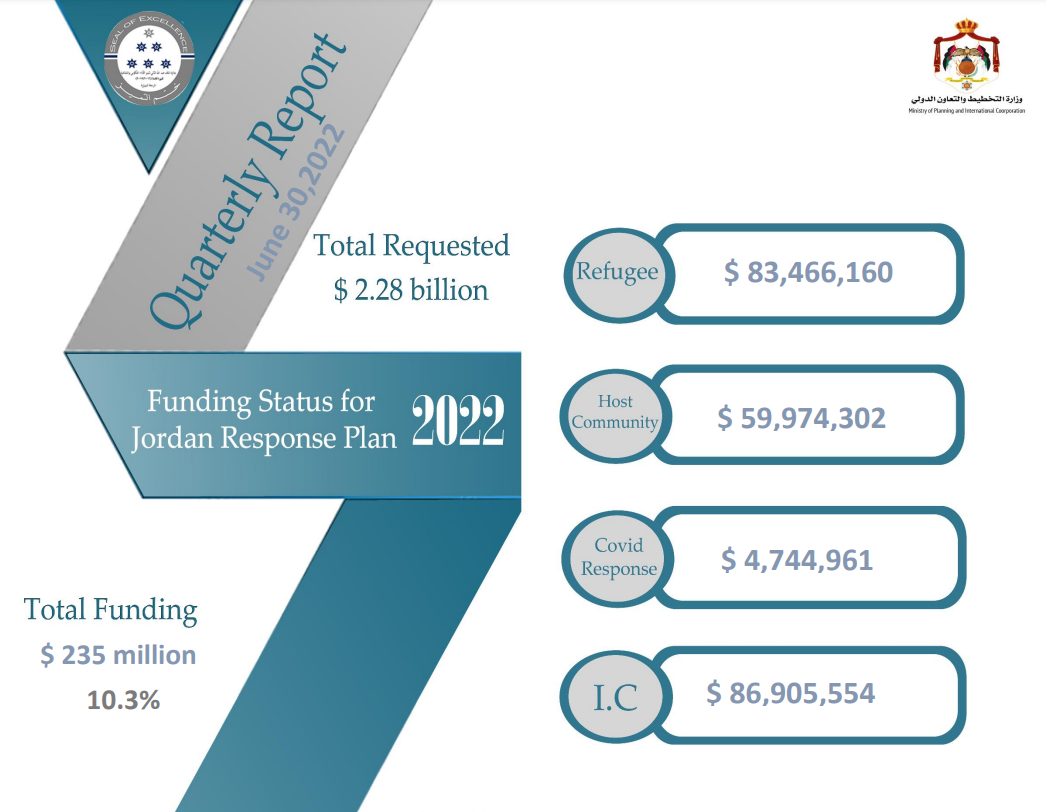 نيروز الإخبارية : بلغ حجم تمويل خطة استجابة الأردن للأزمة السورية 235 مليون دولار للنصف الأول من العام الحالي، من أصل 2.28 مليار دولار، وبنسبة وصلت إلى 10.3%، وفق وزارة التخطيط والتعاون الدولي.