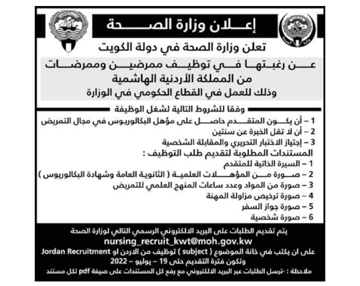 وتستمر فترة التقديم حتى تاريخ 19 تموز 2022، عبر البريد الإلكتروني الرسمي للوزارة (nursing_recruit_kwt@moh.gov.kw)، على أن يُكتب في خانة الموضوع "توظيف من الأردن”.