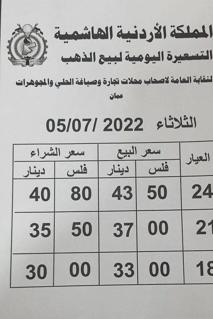 وبلغ سعر بيع الغرام الواحد من الذهب عياري 24 و18 لغايات الشراء من محلات الصاغة عند 43.50 و33.00 دينارا على التوالي.