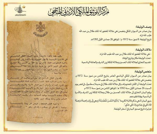 ووفقا لبيان عن المركز اليوم الخميس، بينت الوثيقة أن الأجل وافى جلالته فجر يوم السبت 26 جمادى الأولى عام 1392 هـ، الموافق 8 تموز من عام 1972.