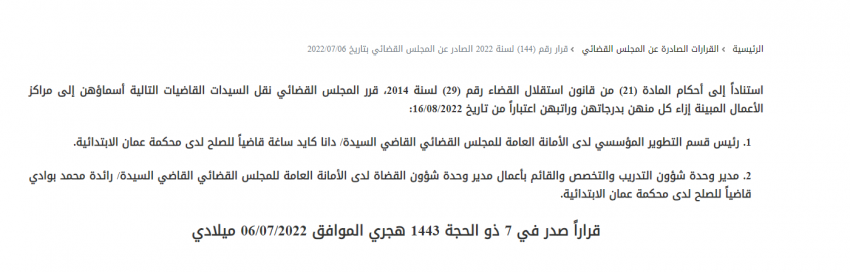 قرر المجلس القضائي نقل القاضيتين التالية أسماؤهما إلى مراكز الأعمال المبينة إزاء كل منهن بدرجاتهن وراتبهن اعتباراً من تاريخ 16 آب المقبل.