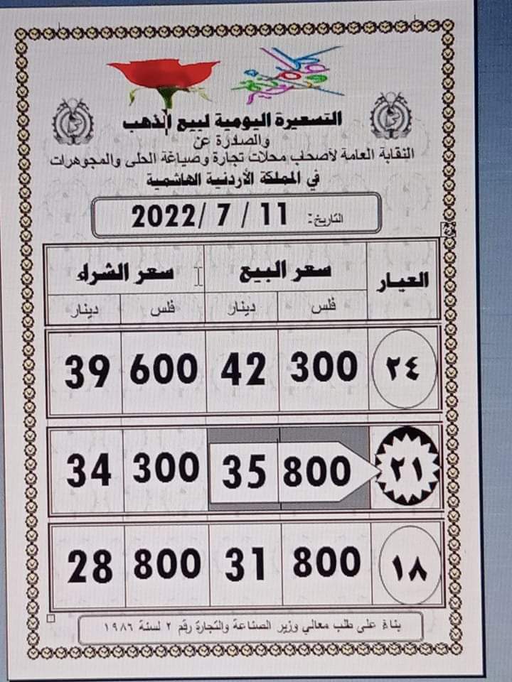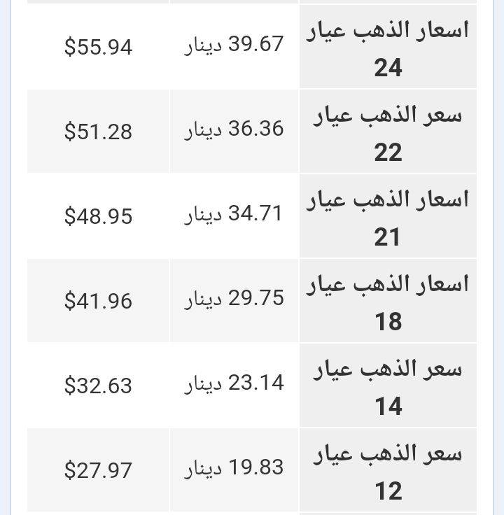 ويشمل التقرير أسعار المعدن في الاردن بجميع عيارته (24,22,21,18,14,12 ) .