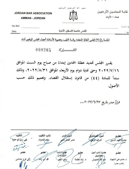 : حدد مجلس نقابة المحامين موعد العطلة القضائية للمحامين الأردنيين لعام 2022 ابتداء من صباح يوم السبت الموافق 16 تموز 2022 حتى نهاية يوم الأربعاء 31 آب 2022.
