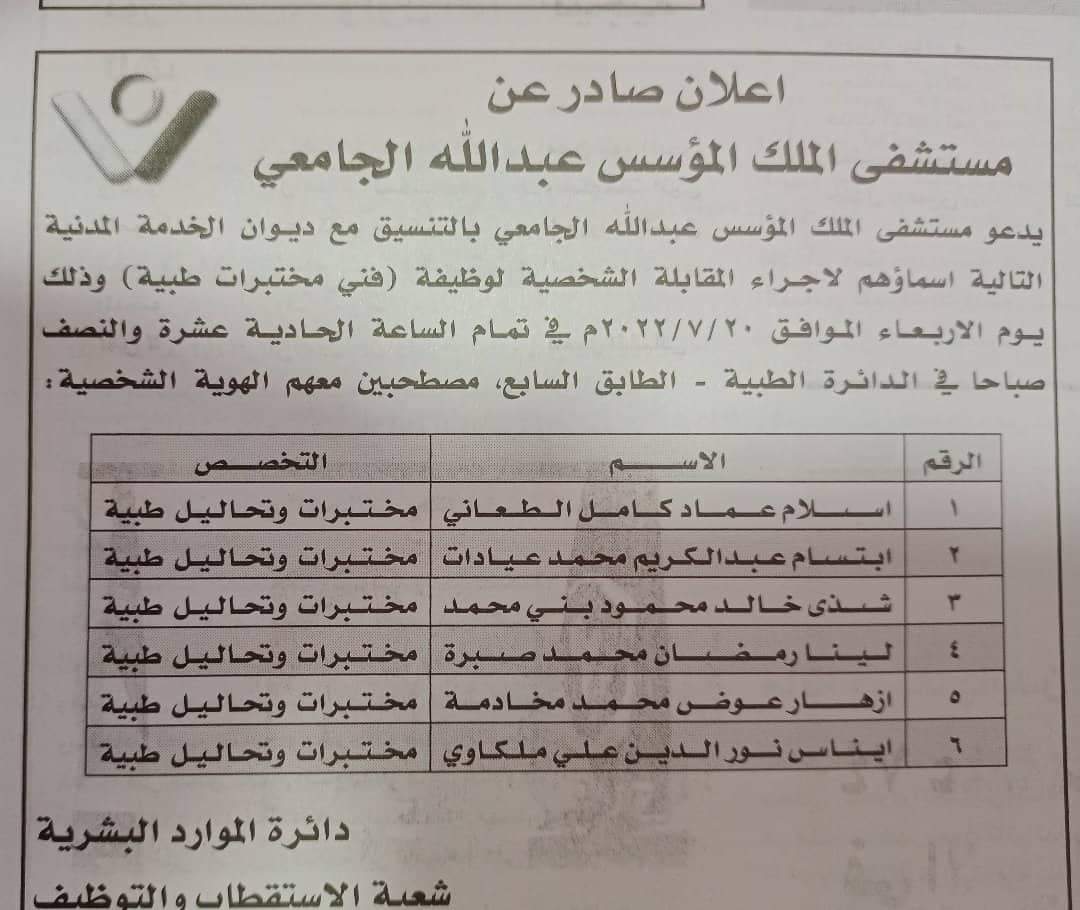 وحدد مستشفى الملك المؤسس عبد الله الجامعي موعدًا لإجراء المقابلة الشخصية وذلك في تمام الساعة الحادية عشرة والنصف صباحًا من يوم الاربعاء الموافق 2022/7/20.