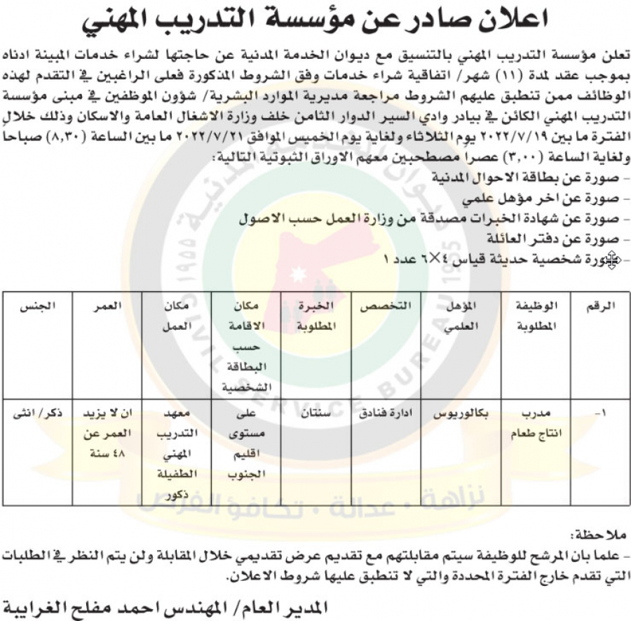 : أعلنت مؤسسة التدريب المهني بالتنسيق مع ديوان الخدمة المدنية عن حاجتها لشراء خدمات لوظيفة مدرب إنتاج طعام.