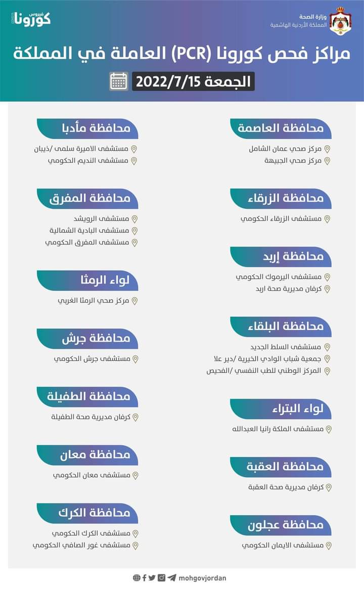 مراكز فحص كورونا (PCR) العاملة في المملكة ( يوم الجمعة 2022/7/15 ) حسب التالي: