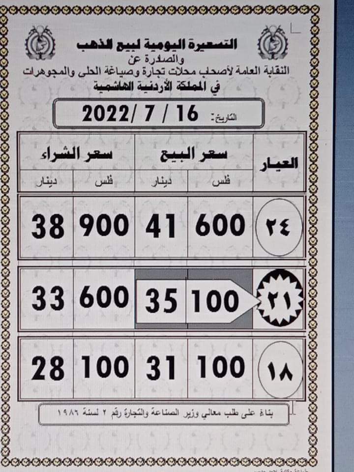 ويشمل التقريــر أسعار المعدن عيارات ( 24، 21، 18) ، كونها الأكثر تداولا في الأردن.