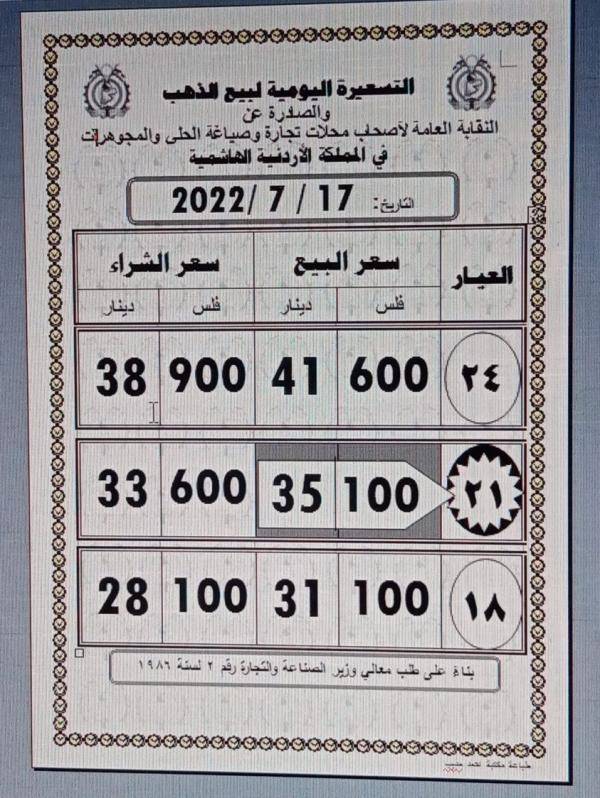 وبلغ سعر غرام الذهب عيار 21 الاكثر طلبا لدى الاردنيين في السوق المحلي 35.10 دينارا لجهة الشراء و 33.60 لجهة البيع.