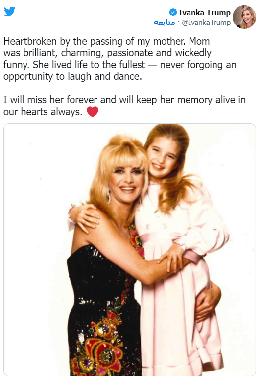 وقالت إيفانكا في تعليق على الصورة: "قلبي مكسور بسبب وفاة والدتي. كانت أمي رائعة وساحرة وعاطفية ومضحكة بشكل كبير. عاشت الحياة على أكمل وجه - ولم تفوت أبدًا فرصة للضحك .. سأفتقدها إلى الأبد وستبقى ذكراها حية في قلوبنا دائمًا".