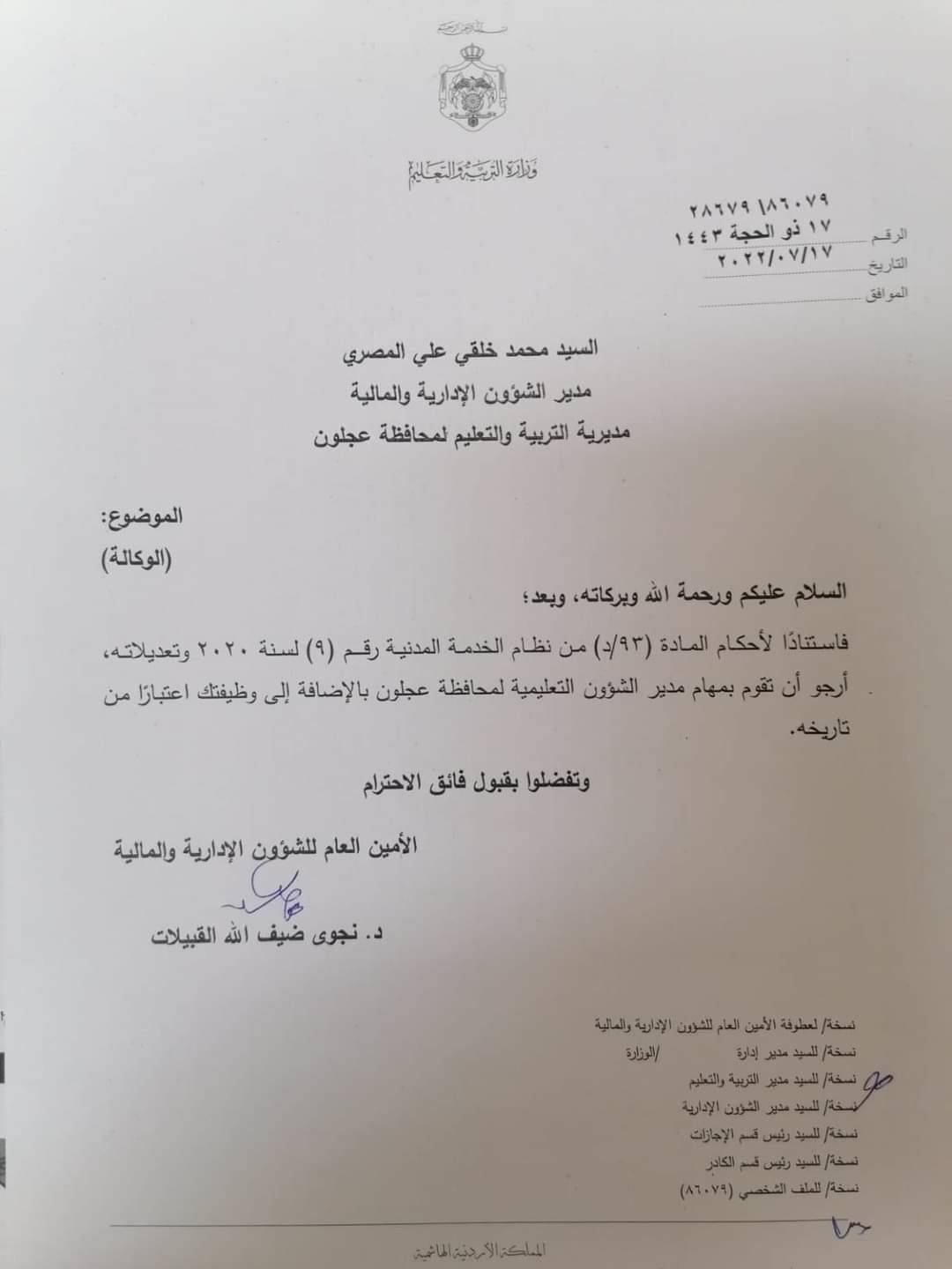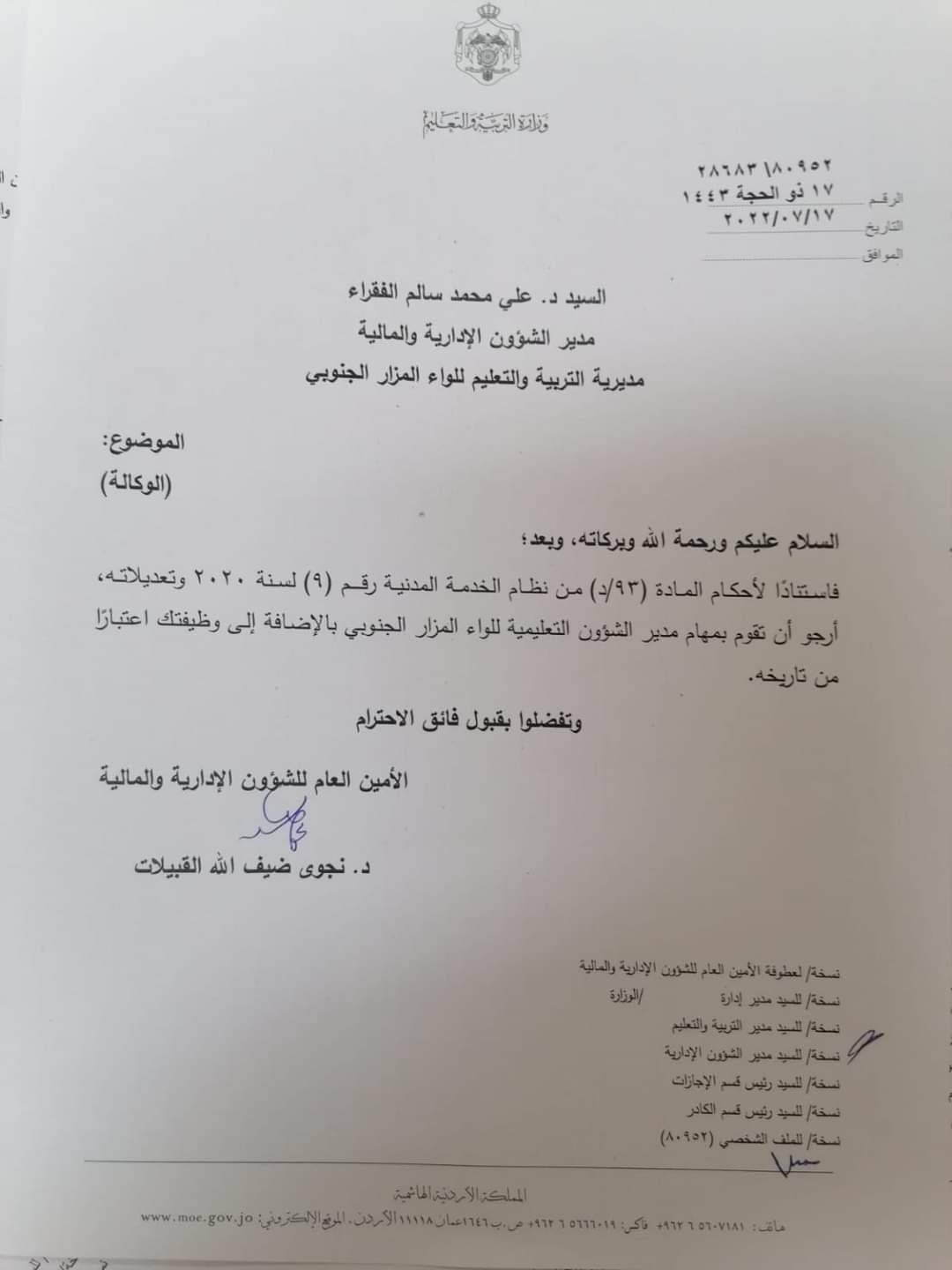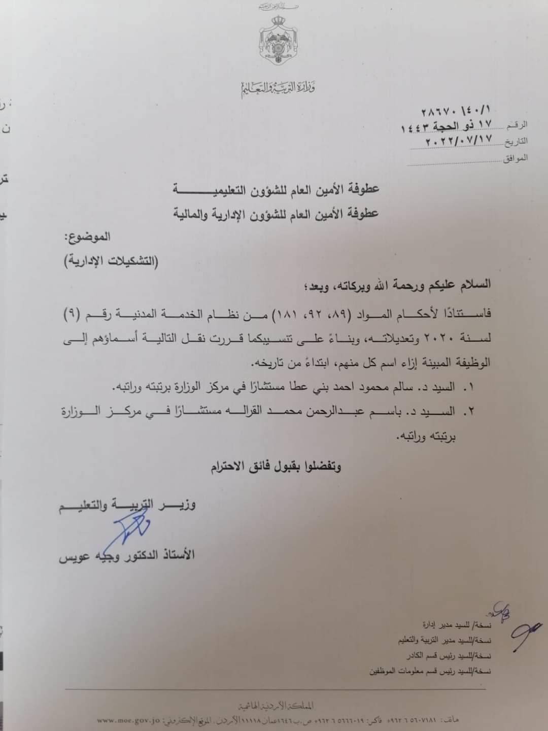 : قرر وزير التربية والتعليم د. وجيه عويس اجراء عدد من التشكيلات الادارية وذلك اعتبارا من تاريخه.