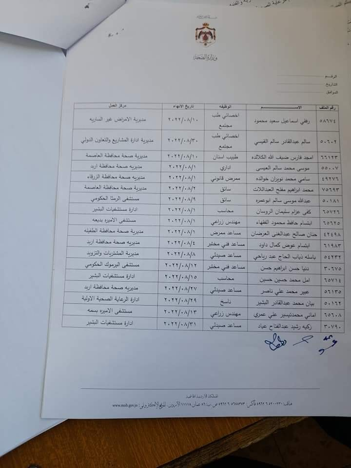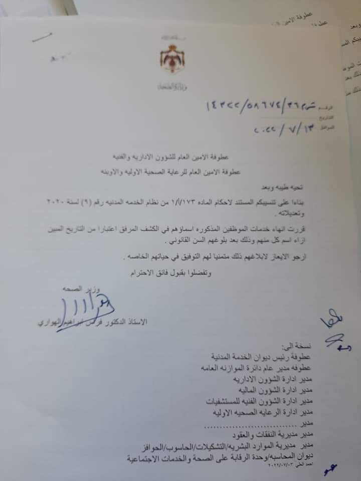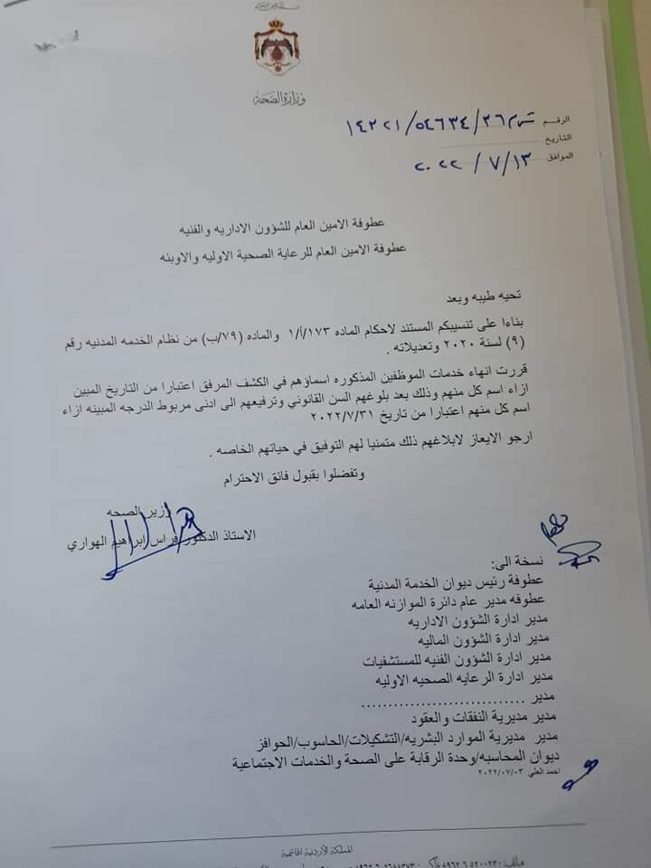 : قرر وزير الصحة الدكتور فراس الهواري انهاء خدمات 27 موظفا لبلوغهم السن القانوني.