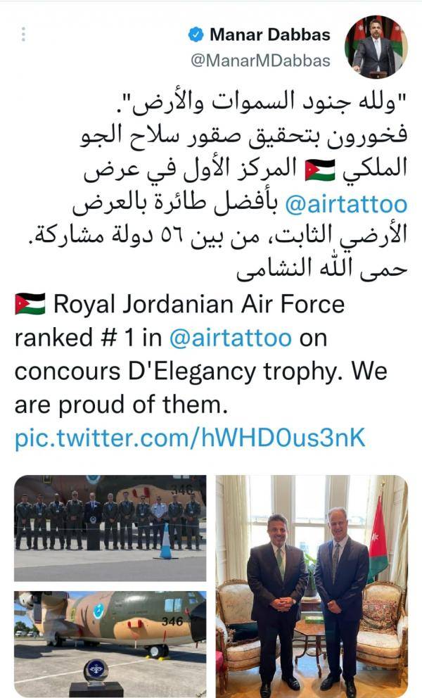 وقال الدباس في تغريدة على حسابه الشخصي على موقع التواصل الاجتماعي تويتر ،‏"ولله جنود السموات والأرض. فخورون بتحقيق صقور سلاح الجو الملكي المركز الأول في عرض بأفضل طائرة بالعرض الأرضي الثابت، من بين ٥٦ دولة مشاركة".