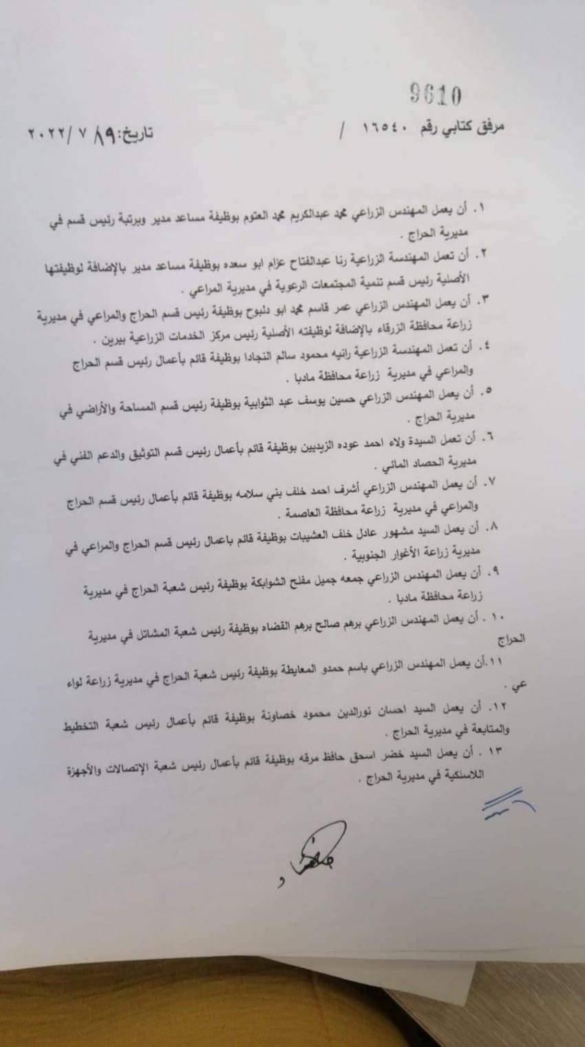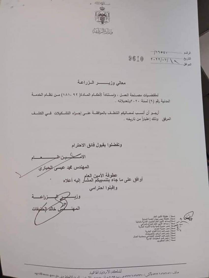 قرر وزير الزراعة المهندس خالد الحنيفات اجراء تشكيلات إدارية في مختلف مديريات الوزارة.