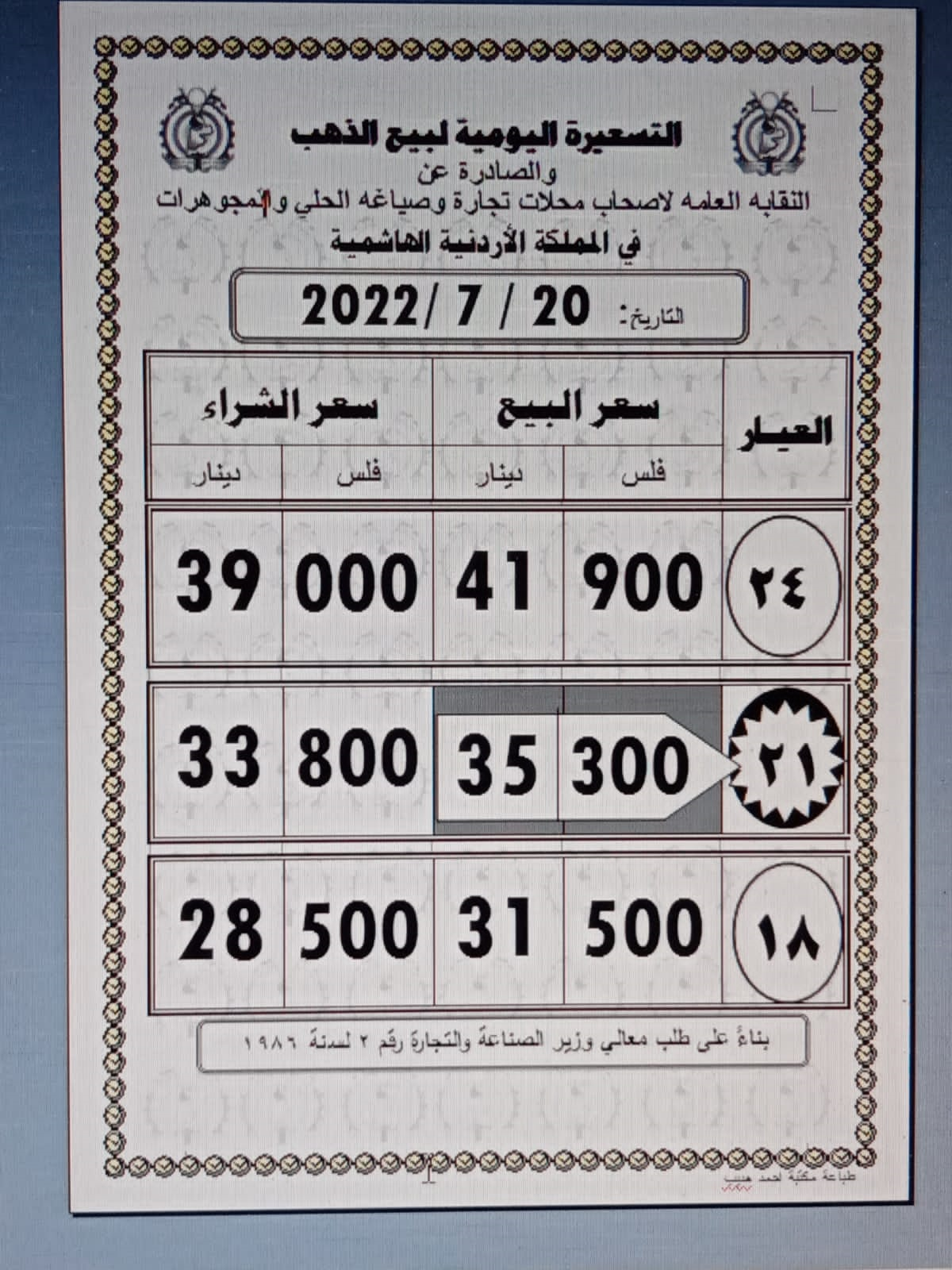 وبلغ سعر غرام الذهب عيار 21 عند 35،30 دينارا، لجهة الشراء من المحلات مقابل 33.80 دينارا لجهة البيع.