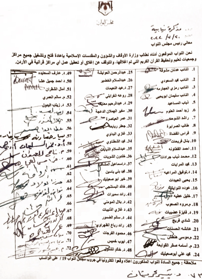 وقع 75 نائبا على مذكرة تبناها النائب عدنان مشوقة ، طالبوا من خلالها وزارة الاوقاف بإعادة فتح وتشغيل جميع مراكز وجمعيات تعليم وتحفيظ القرآن الكريم التي تم اغلاقها.
