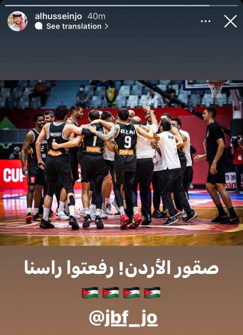 ونشر ولي العهد صورة لمنتخب السلة عبر انستغرام معلقا عليها: صقور الأردن.. رفعتوا راسنا".