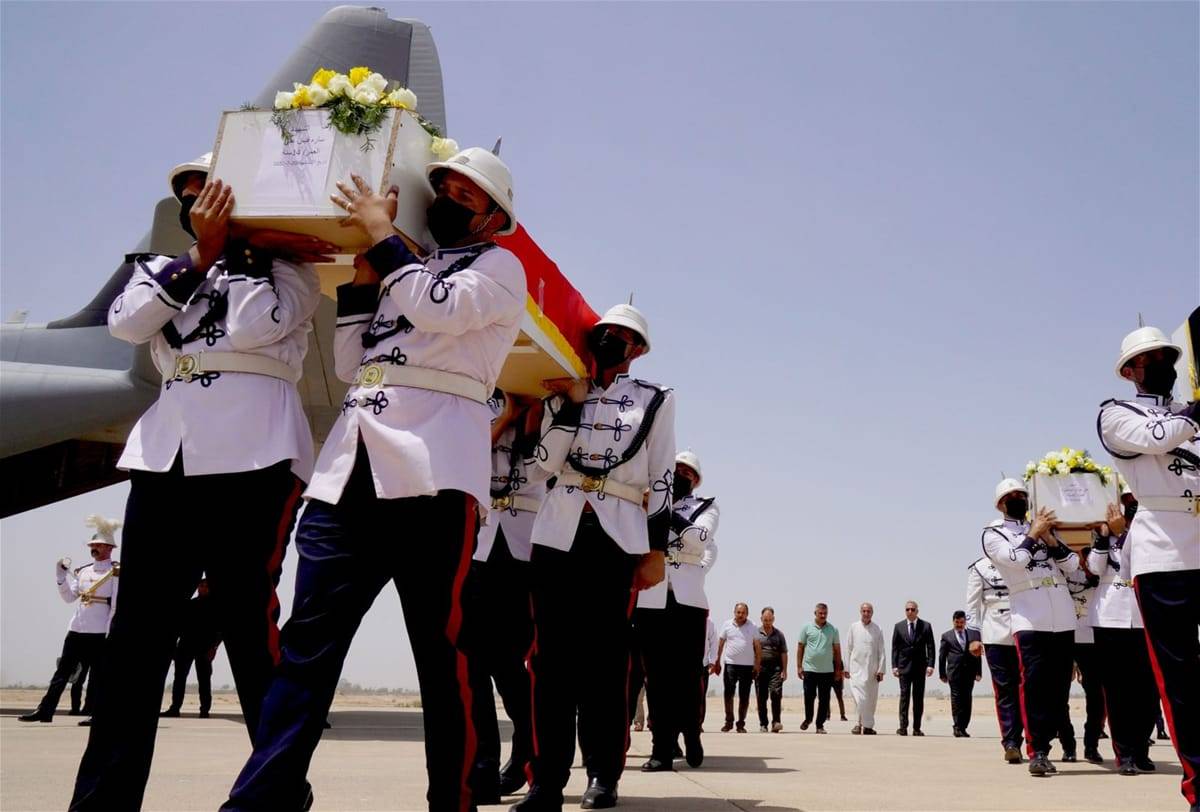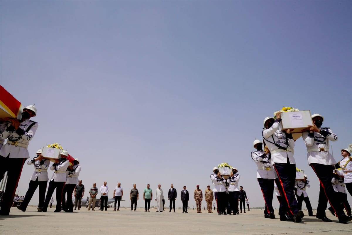 وصلت جثامين ضحايا القصف التركي على دهوك، اليوم الخميس، إلى مطار بغداد الدولي، وسط إجراء تشييع رسمي، تقدّمه رئيس الوزراء مصطفى الكاظمي.