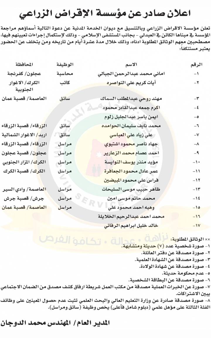 نشر ديوان الخدمة المدنية اعلانًا لاستكمال اجراءات التعيين صادرًا عن مؤسسة الاقراض الزراعي ، وفقًا لما هو مرفق :