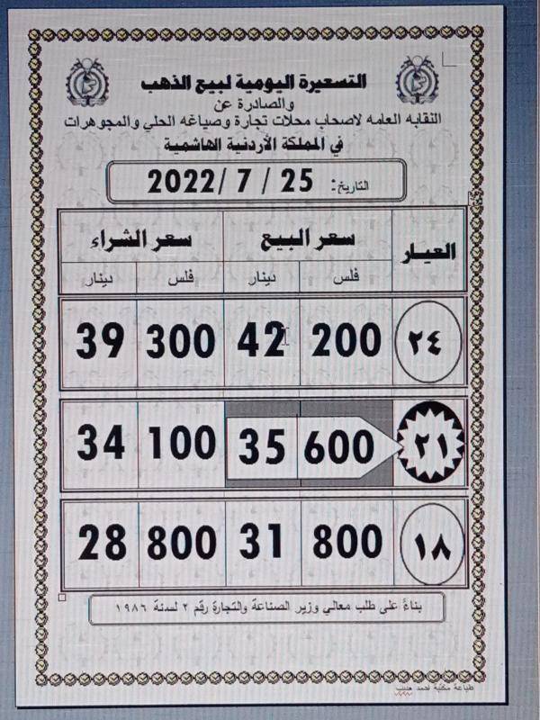 وبلغ سعر غرام الذهب عيار 21 الأكثر طلبا في السوق المحلي 35.60 دينارا لجهة الشراء و 34.10 لجهة البيع.