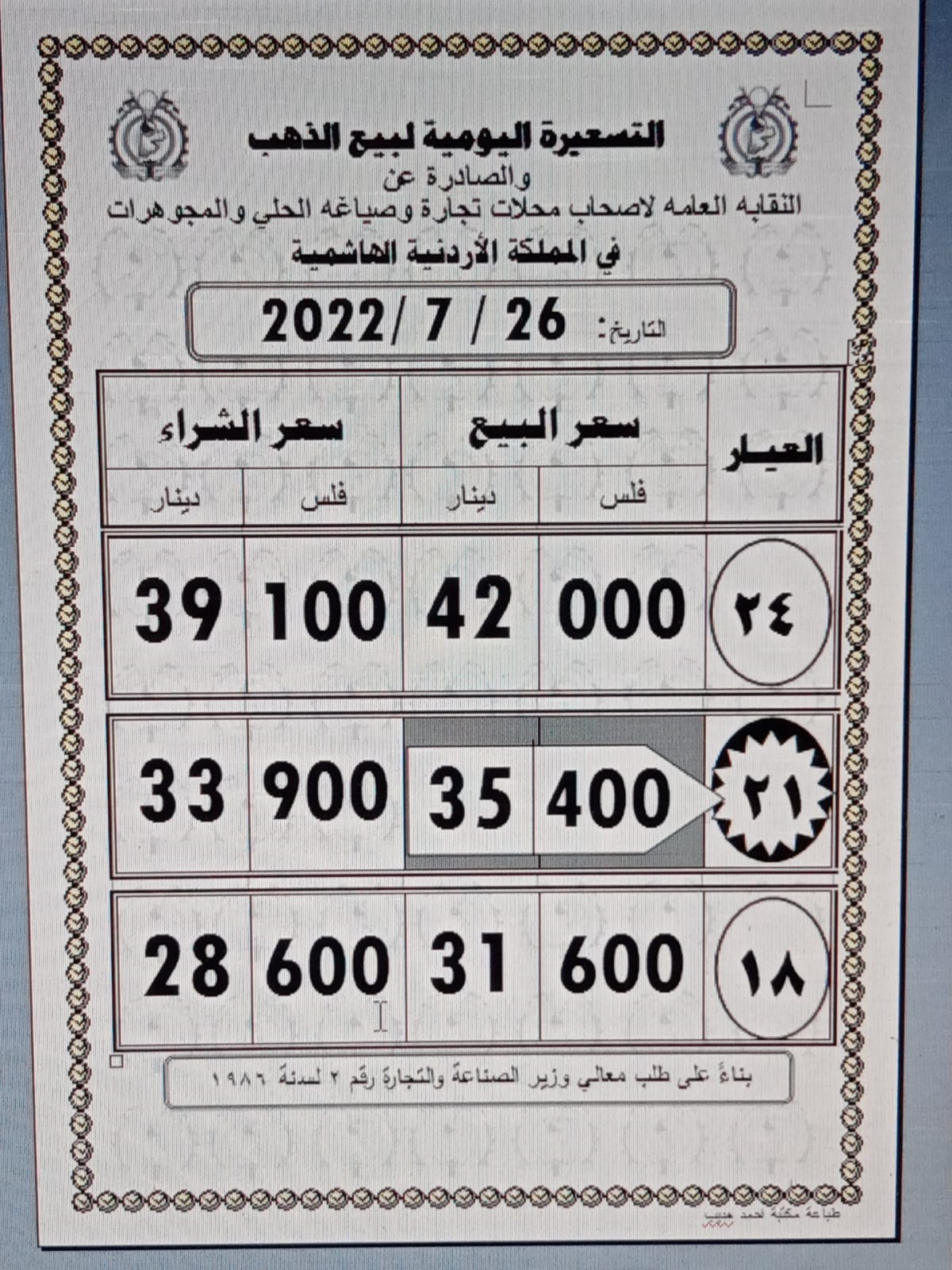 ووفق نقابة أصحاب محلات تجارة وصياغة الحلي والمجوهرات، فقد بلغ سعر بيع غرام الذهب عيار 21 الأكثر رغبة من الأردنيين بالسوق المحلية عند 35.40 دينارا لغايات شراء المواطنين من محلات الصاغة.