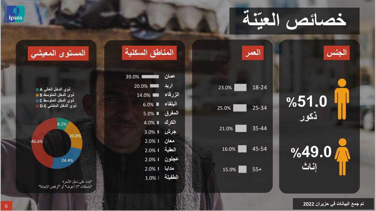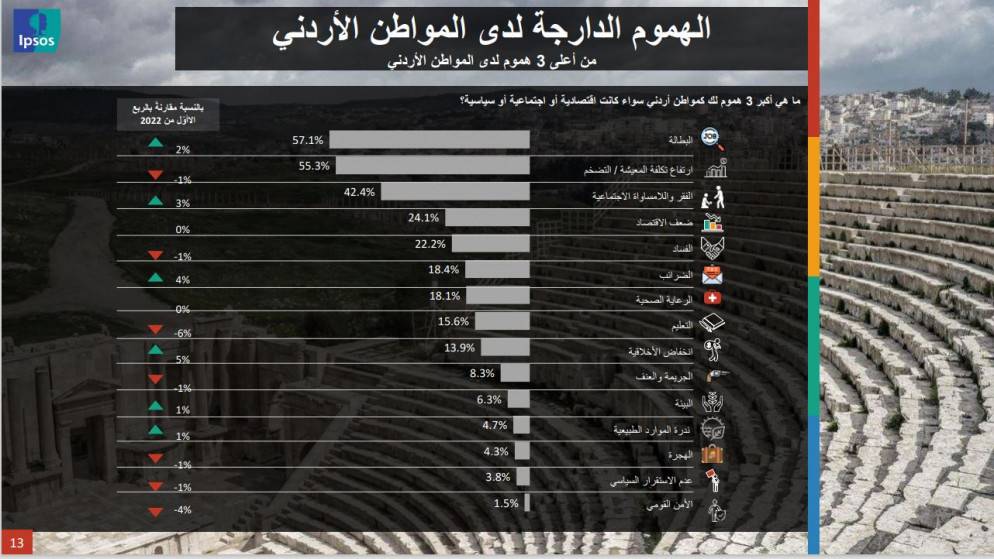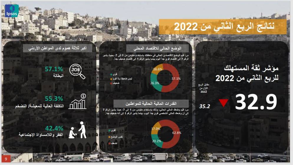 وبحسب إبسوس فإن ما يقارب من 7 من كل 10 أردنيين لديهم نظرة سلبية تجاه الوضع الاقتصادي الحالي في الأردن.وذلك نتيجة التخوف من البطالة والتضخم.