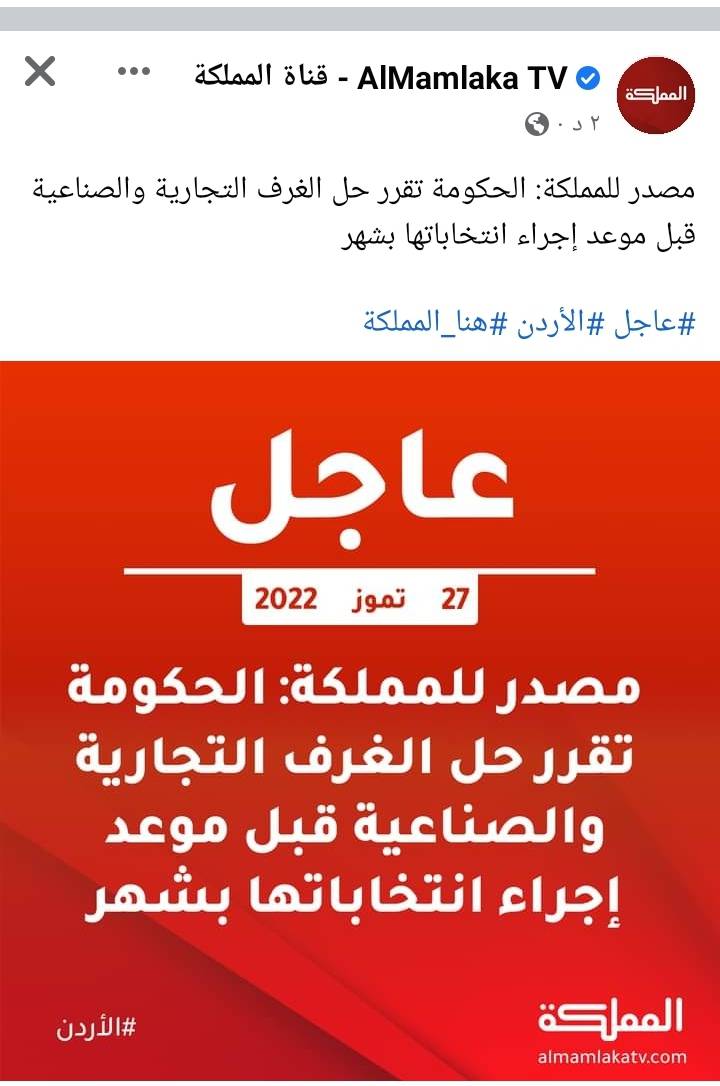 رصدت نيروز من الصفحة الرئيسية بفيسبوك لقناة المملكة ، بأن مصدرًا قال إن الحكومة تقرر حل الغرف التجارية والصناعية قبل موعد إجراء انتخاباتها بشهر .