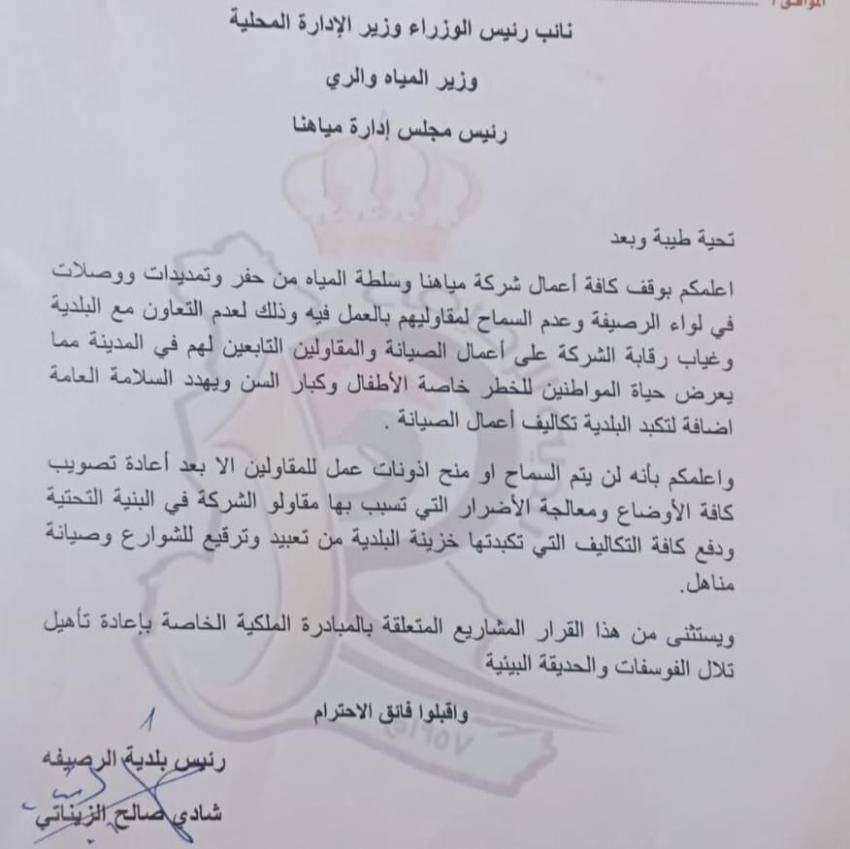 قررت بلدية الرصيفة إيقاف اعمال شركة مياهنا وسلطة المياه في اللواء من حفر وتمديدات ووصلات وعدم السماح للمقاولين بالعمل ضمن حدود البلدية.
