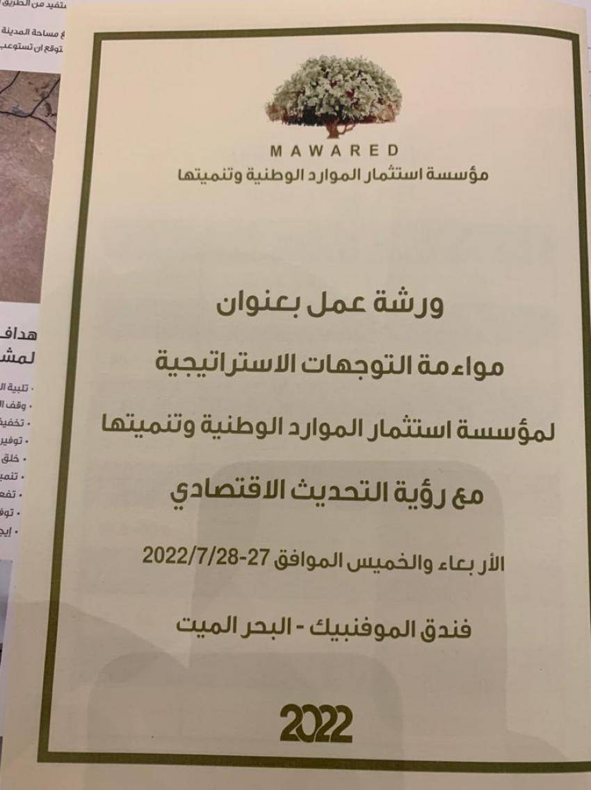 اقامت مؤسسة استثمار الموارد الوطنية وتنميتها ورشة عمل بعنوان "مواءمة التوجهات الاستراتيجية لمؤسسة موارد مع رؤية التحديد الاقتصادي"، بحضور اعضاء مجلس ادارة المؤسسة وكبار المستثمرين في مدينة الملك عبدالله بن عبد العزيز.