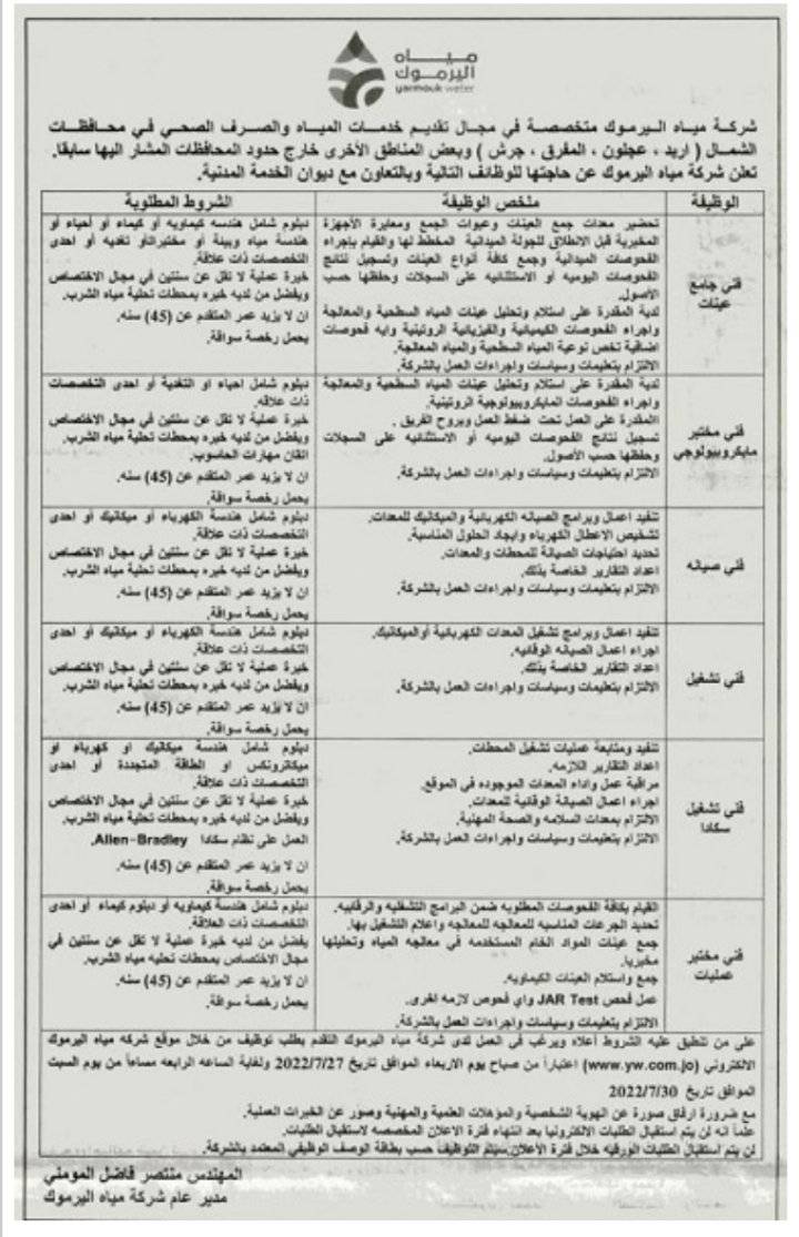 مياه اليرموك تطلب موظفين