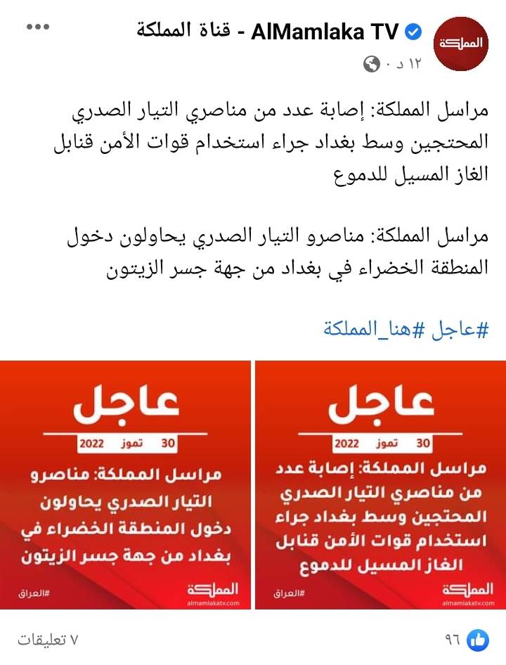 نقلت قناة المملكة عبر صفحتها بفيسبوك وفقًا لمراسلها ، إصابة عدد من مناصري التيار الصدري المحتجين وسط بغداد جراء استخدام قوات الأمن قنابل الغاز المسيل للدموع .