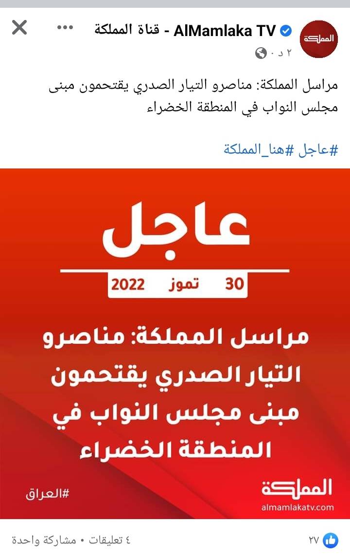 نقلت قناة المملكة عبر صفحتها بفيسبوك وفقًا لمراسلها أن مناصرو التيار الصدري يقتحمون مبنى مجلس النواب في المنطقة الخضرا .