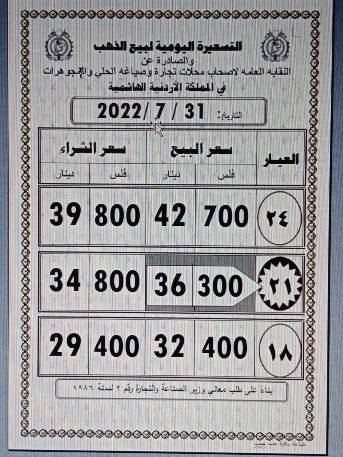 ووفق نقابة أصحاب محلات تجارة وصياغة الحلي والمجوهرات، فقد بلغ سعر بيع غرام الذهب عيار 21 الأكثر رغبة من الأردنيين بالسوق المحلية عند 36.30 دينارا لغايات شراء المواطنين و 34.80 لغاية البيع.