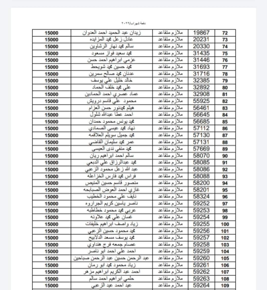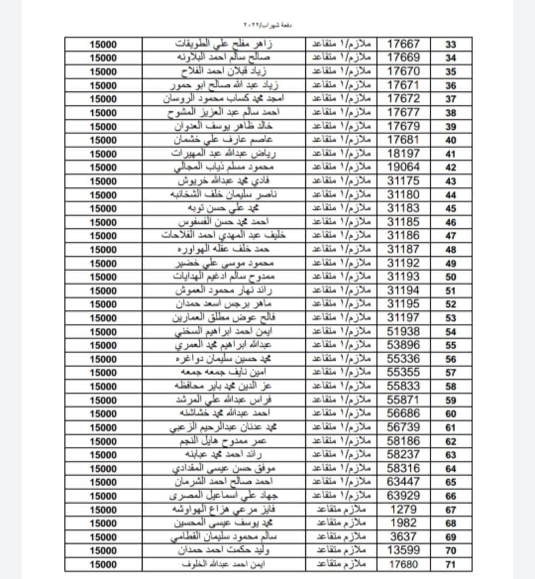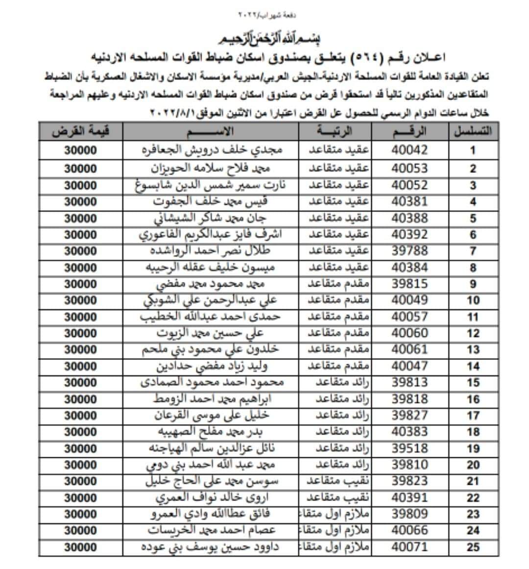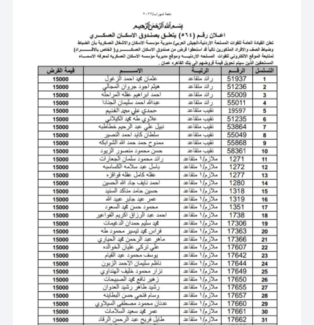 تعلن القيادة العامة للقوات المسلحة الأردنية_ الجيش العربي/ مديرية مؤسسة الإسكان والأشغال العسكرية بأن الضباط وضباط الصف والأفراد المبينة أسمائهم أدناه قد استحقوا قرض الإسكان العسكري وعلى الضباط المستفيدين من صندوق إسكان الضباط مراجعة مديرية الإسكان والأشغال العسكرية خلال ساعات الدوام الرسمي اعتباراً من يوم الأحد الموافق 31/7/2022 للحصول على القرض والضباط وضباط الصف والأفراد المستفيدين من صندوق الإسكان العسكري (الخاص بالأفراد) سيتم تحويل قيمة قرض الإسكان إلى بنك القاهرة عمان لمتابعة الموقع الإلكتروني للقوات المسلحة الأردنية لمعرفة أسماء المستحقين الذين سيتم تحويل قيمة قروضهم للبنك.