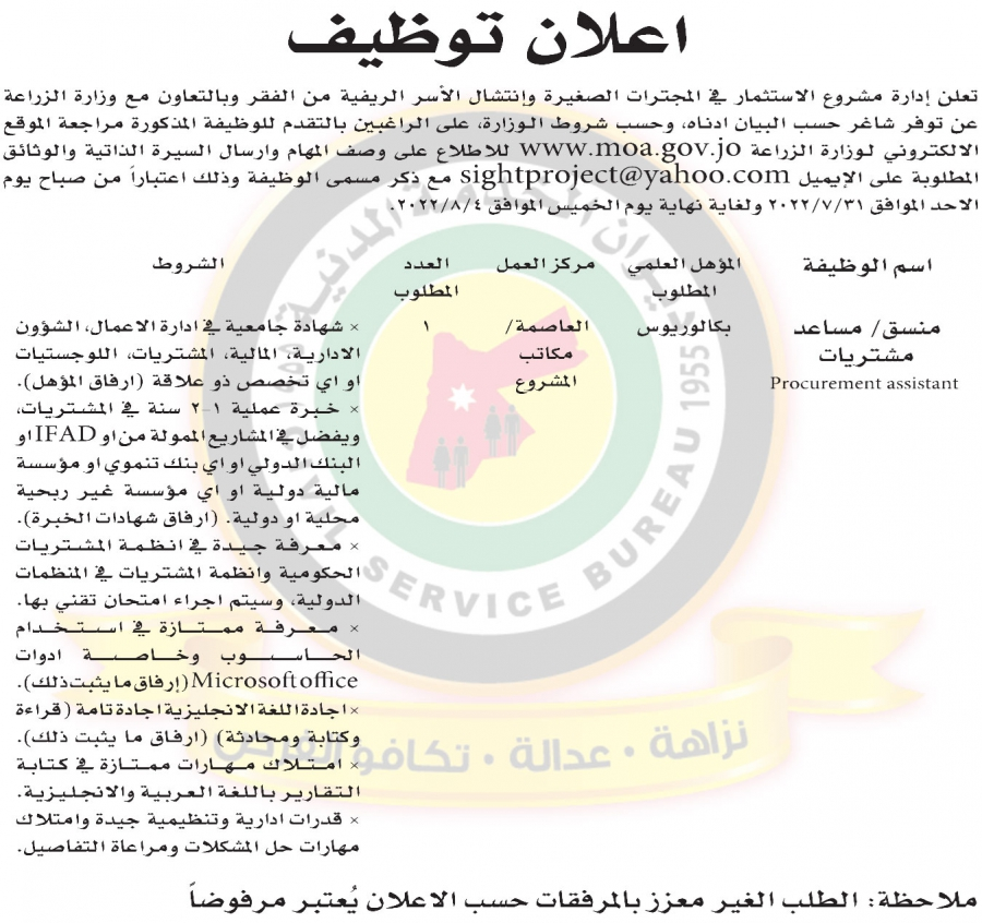 : نشرت إدارة مشروع الاستثمار في المجترات الصغيرة وانتشال الأسر الريفية من الفقر بالتعاون مع وزارة الزراعة إعلان توظيف.