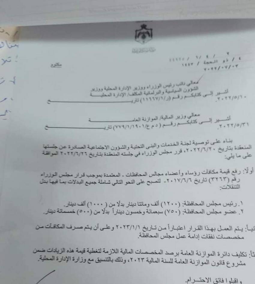 وأقر مجلس الوزراء، العمل بالقرار اعتبارا من تاريخ 1/1/2023 على أن يتم صرف المكافآت من مخصصات نفقات ادامة عمل مجلس المحافظة.