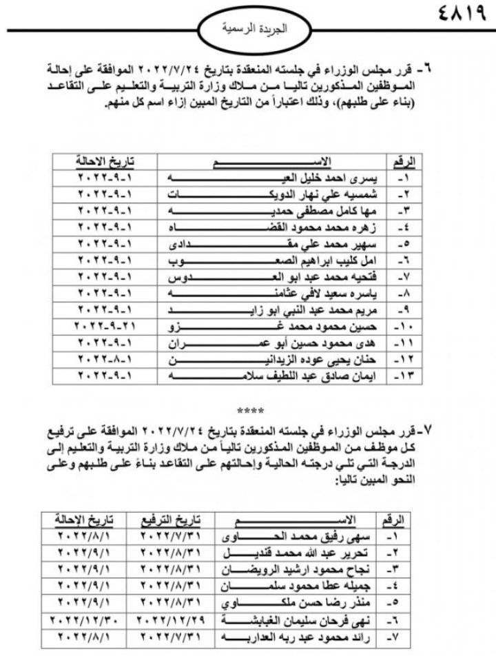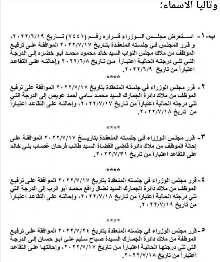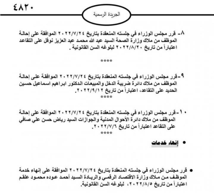 قرر مجلس الوزراء، احالة موظفين حكوميين إلى التقاعد، وإنهاء خدمات آخرين.