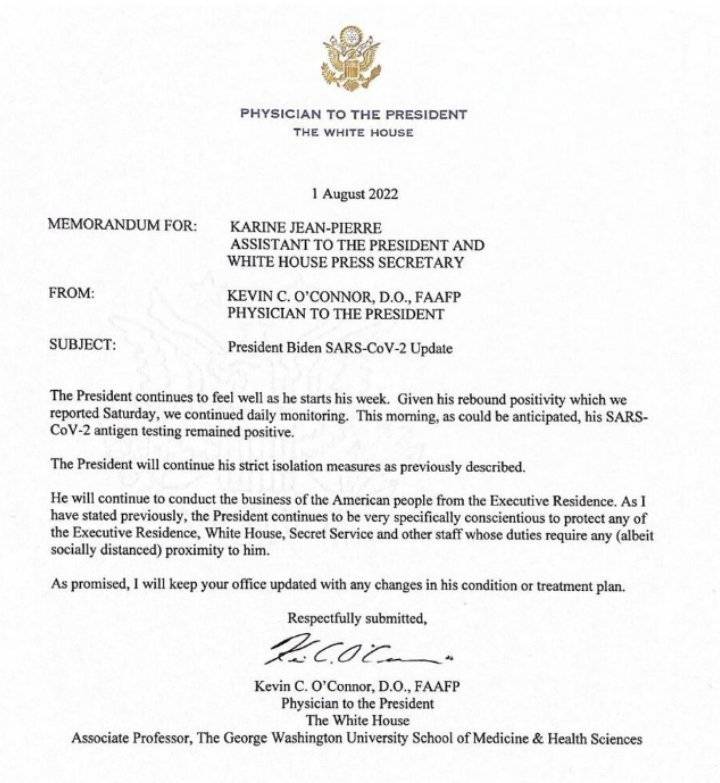 وقال أوكونور: "يستمر الرئيس في الشعور بالارتياح في بداية الأسبوع الحالي.. نظرا لإيجابية الفحص التي أبلغنا عنها يوم السبت، واصلنا المراقبة اليومية. وهذا الصباح، كما كان متوقعا، بقي اختباره لكوفيد -19 إيجابيا"، مؤكدا أن بايدن سيواصل العمل من البيت الأبيض.