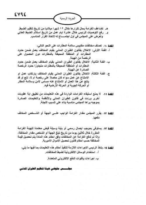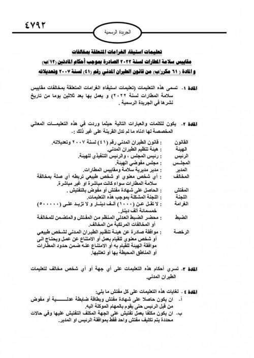 أصدر مجلس مفوضي هيئة تنظيم الطيران المدني، تعليمات استيفاء الغرامات المتعلقة بمخالفات مقاييس سلامة المطارات لسنة 2022، وفق عدد الجريدة الرسمية الصادر الإثنين.