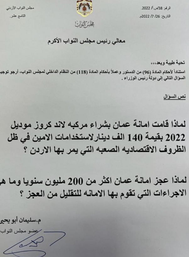 وجه النائب سليمان ابو يحيى ، الثلاثاء، سؤالاً نيابيا لرئيس الوزراء بشر الخصاونة، حول شراء مركبة لاند كروزر موديل 2022 بقيمة 140 ألف دينار لأمين عمان يوسف الشواربة في ظل الظروف الاقتصادية الصعبة.