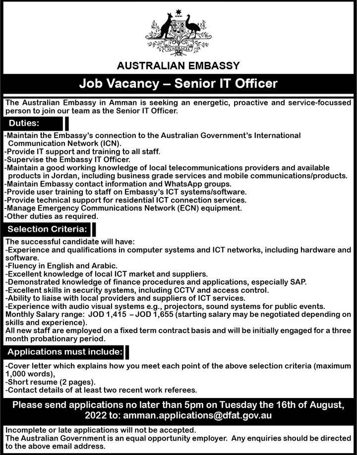 To find out more, including how to apply please visit: https://jordan.embassy.gov.au/files/aman/IT%20Senior%20Officer.pdf