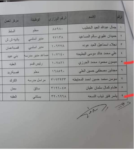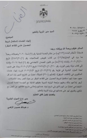 : قرر وزير التربية والتعليم الدكتور وجيه عويس انهاء خدمات عدد من موظفين لاستكمالهم شروط الحصول على التقاعد المبكر.