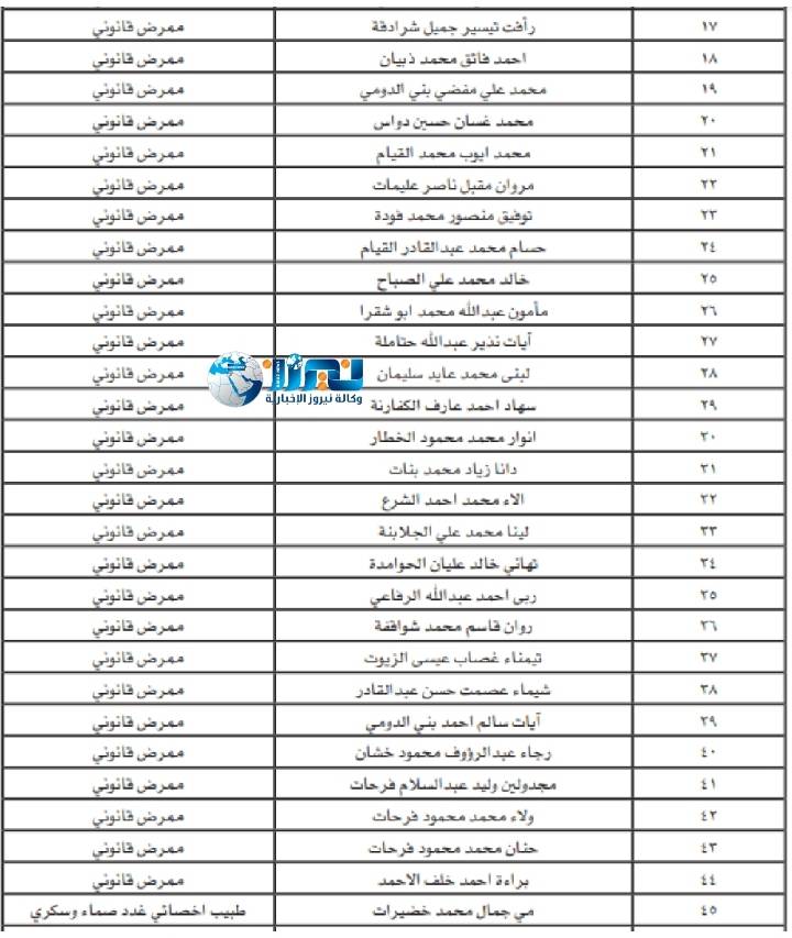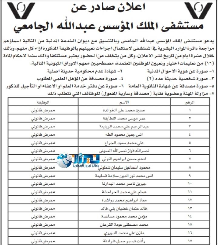 دعا مستشفى الملك المؤسس عبدالله الجامعي بالتنسيق مع ديوان الخدمة المدنية التالية اسماؤهم مراجعة دائرة الموارد البشرية في المستشفى لاستكمال إجراءات تعيينهم .