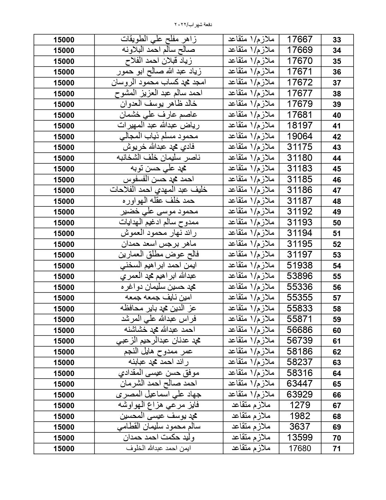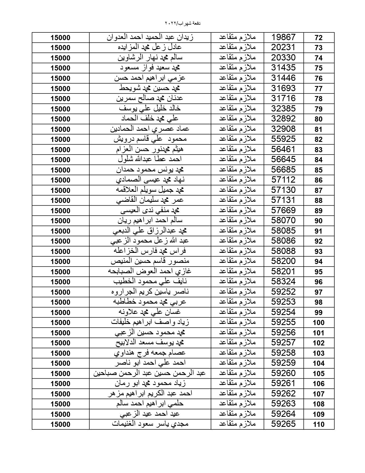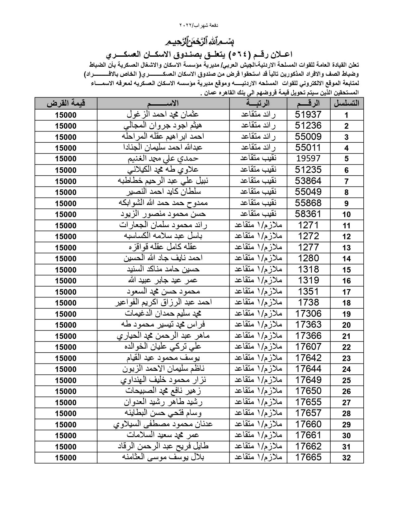 أعلنت القيادة العامة للقوات المسلحة الأردنية – الجيش العربي مديرية الإسكان والاشغال العسكرية، أسماء المستحقين لقرض صندوق الإسكان العسكري لدفعة شهر آب لعام 2022.