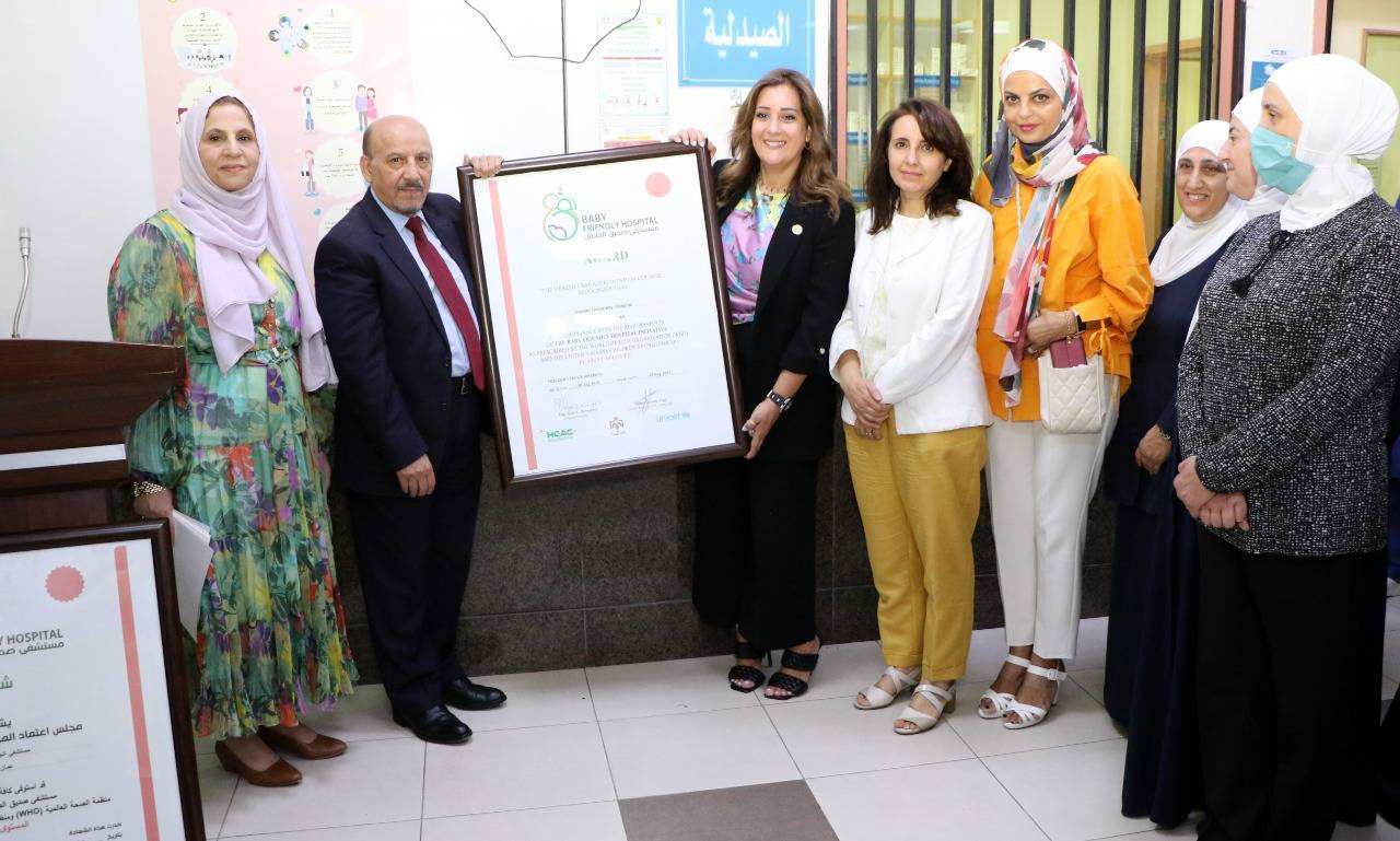 وأعربت الرئيس التنفيذي لمجلس اعتماد المؤسسات الصحية السيدة سلمى الجاعوني عن فخر المجلس واعتزازه بحصول المستشفى على شهادة اعتماده كمستشفى صديق للطفل للمرة الثانية على التوالي- المستوى البلاتيني-، مؤكدةً على أن هذه الشهادة ما هي إلا توثيق واضح للعمل الدؤوب الذي قدمته الكوادر ذات العلاقة والمسلّحة بالمعلومات والإجراءات الصحيحة، مُشيرةً إلى أن مشوار الجودة لا ينتهي بالشهادة وإنما يستمر بالعمل الجاد سعياً إلى تحسين الخدمات المُقدّمة للأم والطفل مع ضرورة اتباع الأسس العلمية للرضاعة الطبيعية.