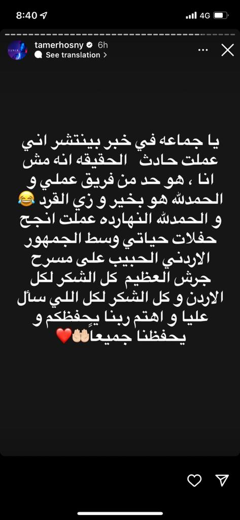 تامر حسني يعلق على خبر تعرضه لحادث سير في الأردن